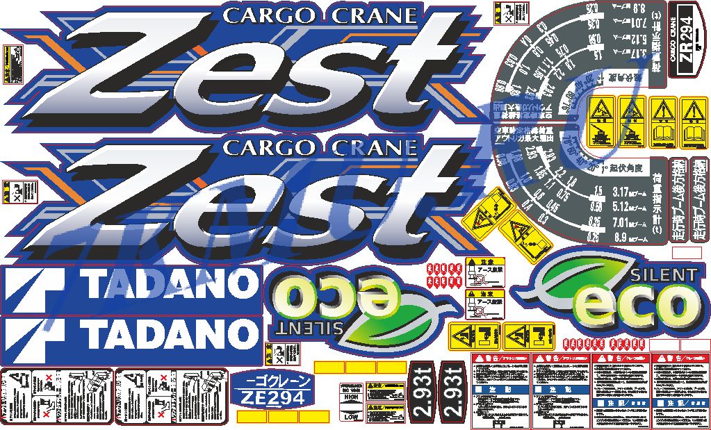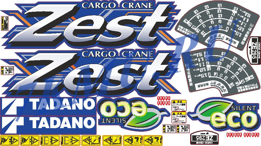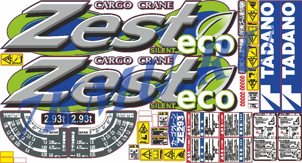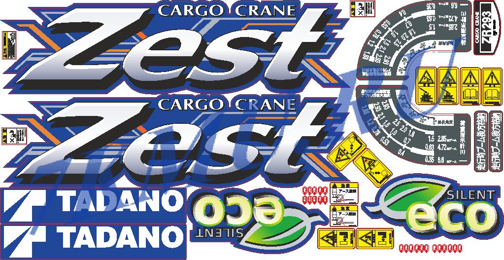 Комплект наклеек на стрелу кран-манипулятора Tadano Zest ZE (Zest Eco) 290 - полная копия оригинальных японских наклеек.