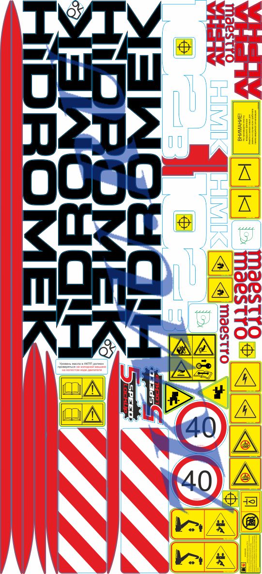 Комплекты стикеров для экскаватора-погрузчика Hidromek 102b максимально точно повторяют размеры и цветовую гамму оригинальных наклеек.