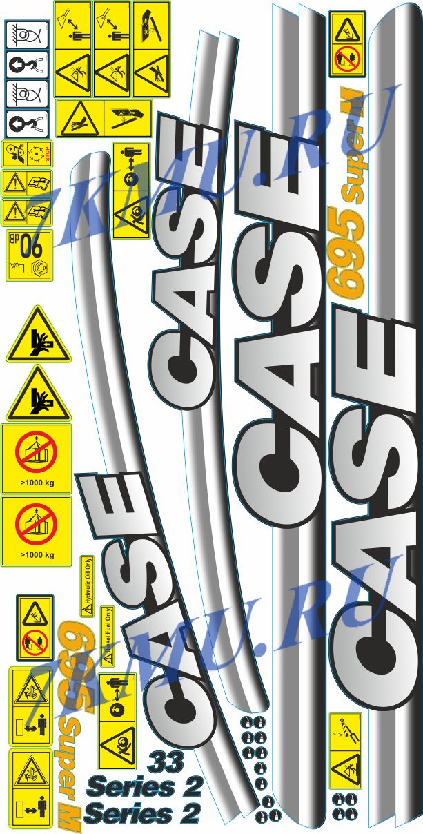 В состав комплекта наклеек входят основные стикеры с логотипом фирмы производителя экскаватора-погрузчика Кейс 695 и обозначением модели, вспомогательные предупреждающие и информационные наклейки.