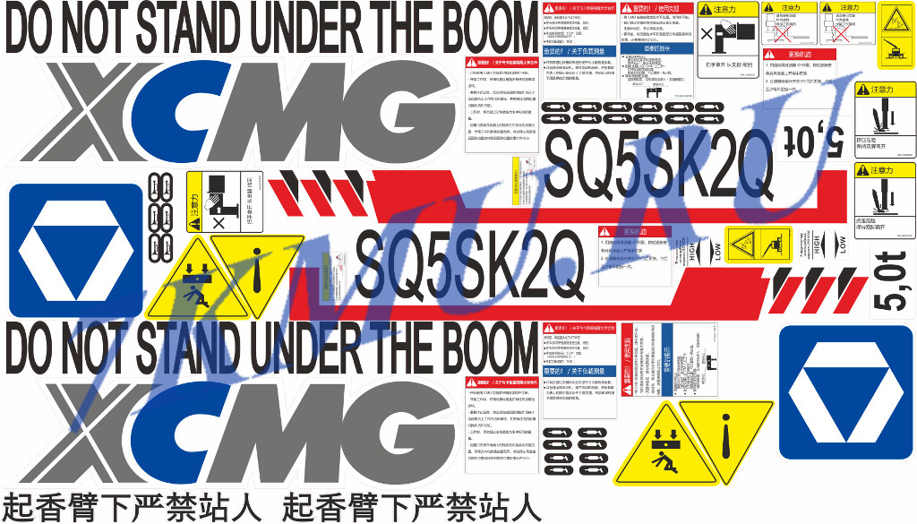 В состав комплекта наклеек входят основные стикеры с логотипом фирмы производителя КМУ XCMG SQ5SK2Q и обозначением модели, вспомогательные предупреждающие и информационные наклейки.