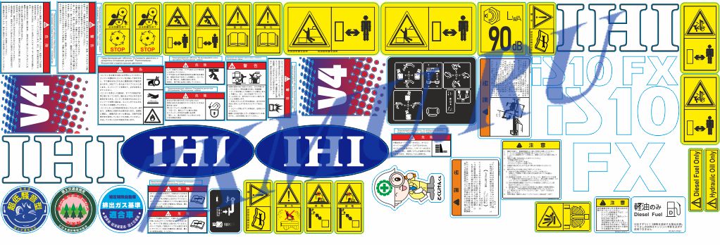 В состав комплекта наклеек входят основные стикеры с логотипом фирмы производителя мини-экскаватора IHI 10FX и обозначением модели, графики рабочих характеристик, вспомогательные предупреждающие и информационные наклейки.