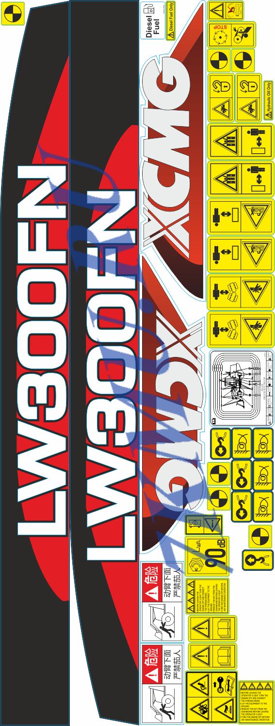 В состав комплекта наклеек входят основные стикеры с логотипом фирмы производителя погрузчика XCMG LW300FN и обозначением модели, вспомогательные предупреждающие и информационные наклейки.